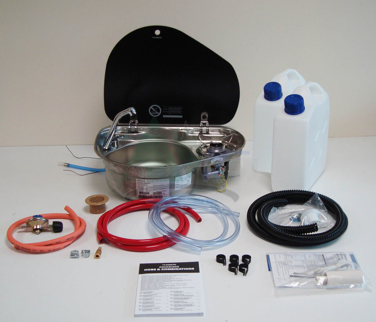 Simply use the option sets at the top of the page to pick your preference between a left or right handed sink, mixer or cold tap and whether you require the kit supplied with the Camping Gaz Regulator or the Bulk Head Regulator (please see below for the full contents of what is supplied with each regulator option).