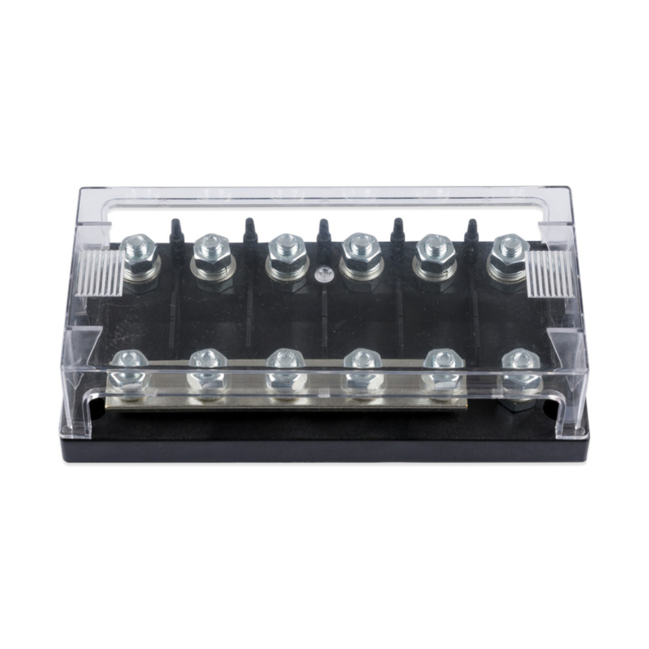 This compact 6 way MEGA fuse holder with 5 fuse busbar connection provides secure connections up to a maximum current of 250A. This bespoke 6 way MEGA fuse holder allows fuses to be mounted securely and safely. The clear housing cover provides some protection from dust and debris as well as the ability to allow fault diagnostics when needed.